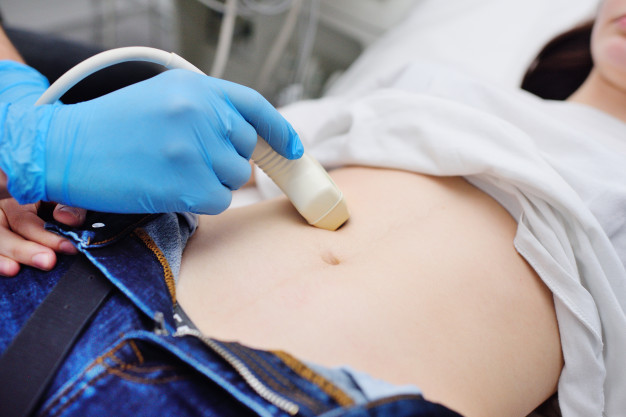 - Датчик ультразвукового аппарата плавно перемещается по поверхности живота.